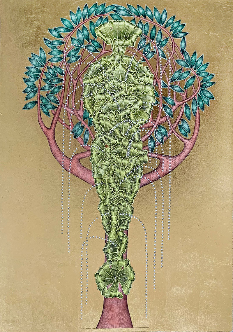 2023, 20 x 20 cm, Aquarell, Blattgold, Papierschnitt